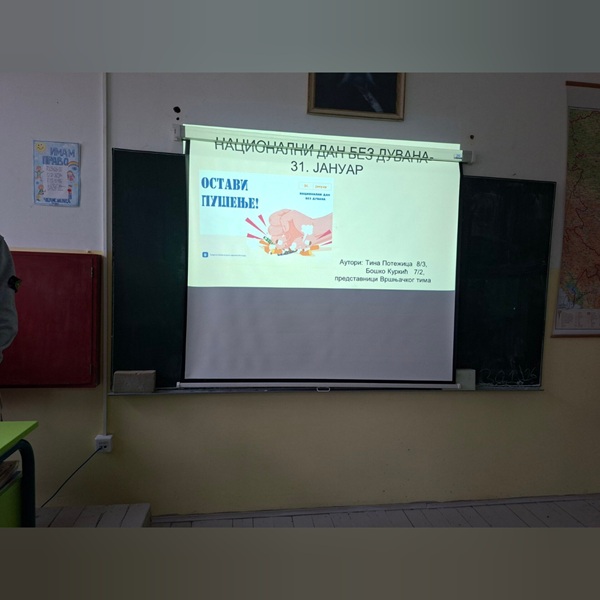 Поводом Националног дана без дувана који се ове године одржава под слоганом „Сваког дана без дувана“, чланови Вршњачког тима Бошко Куркић, Тина Потежица, Лејла Голубовић и Ајша Гановић одржали су превентивна предавања за ученике сва четири одељења четвртог разреда у матичној школи. Предавања су се бавила штетним последицама употребе дуванских производа, као и пасивног пушења.